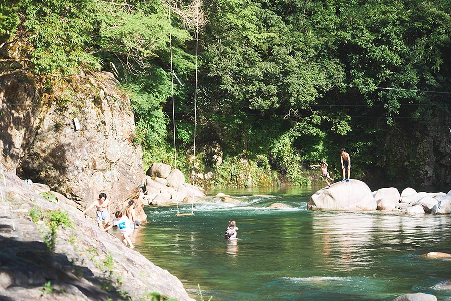 清流での水遊びや、川沿いのデッキでゆったりくつろぐ時間は、日常を忘れて自然とつながる特別なひととき。