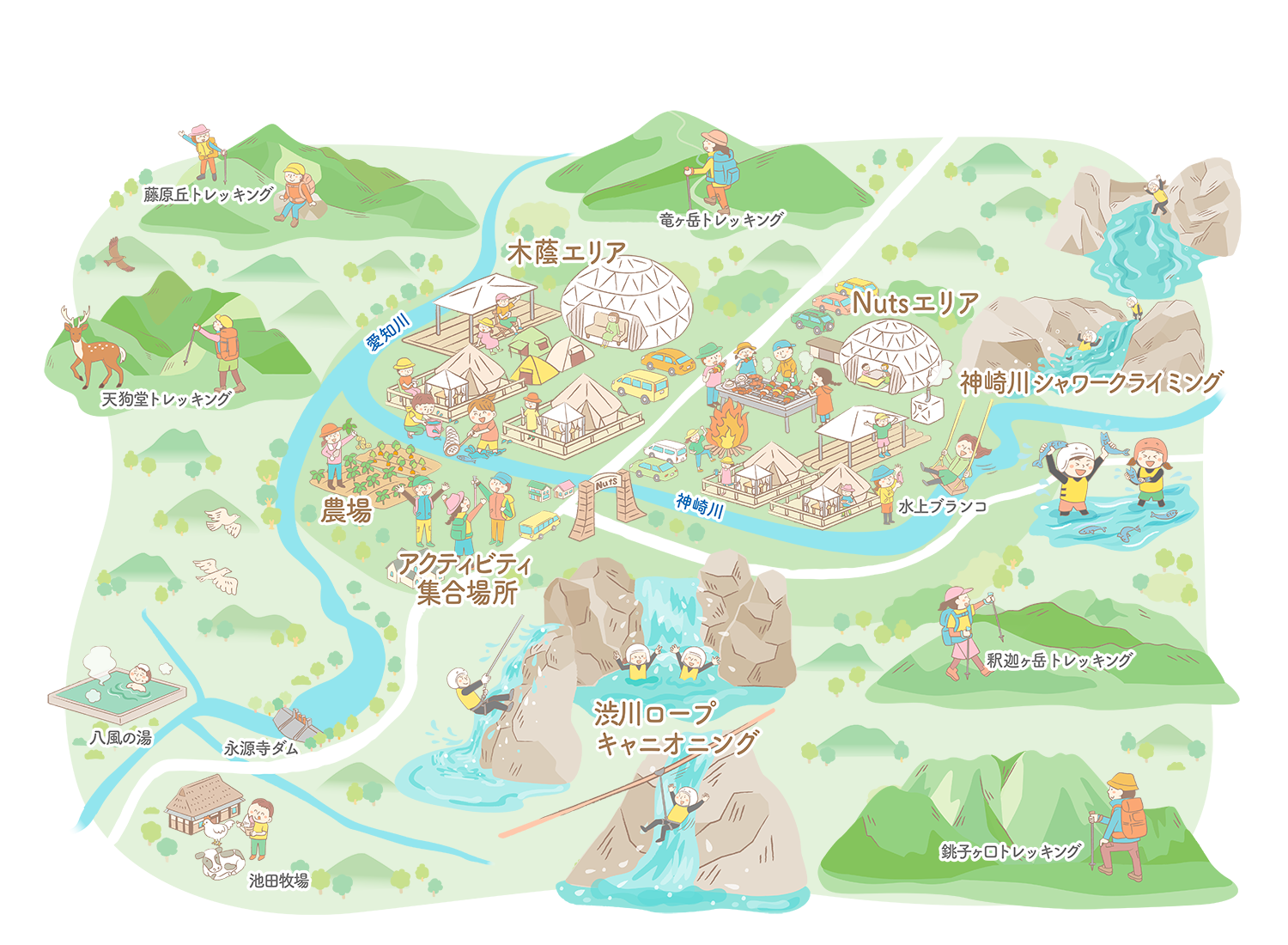 その中を流れる神崎川は、エメラルドグリーンに輝く透明度の高い清流で、川遊びや渓流アクティビティの聖地としても知られています。